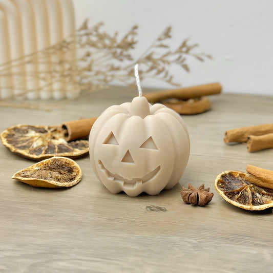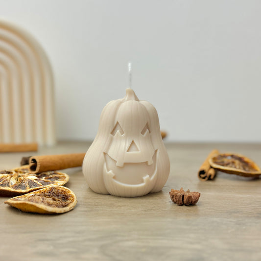 Beige Carved Pumpkin Halloween Candle - Spiced Pumpkin Candle - Carved Jack-O-Lantern