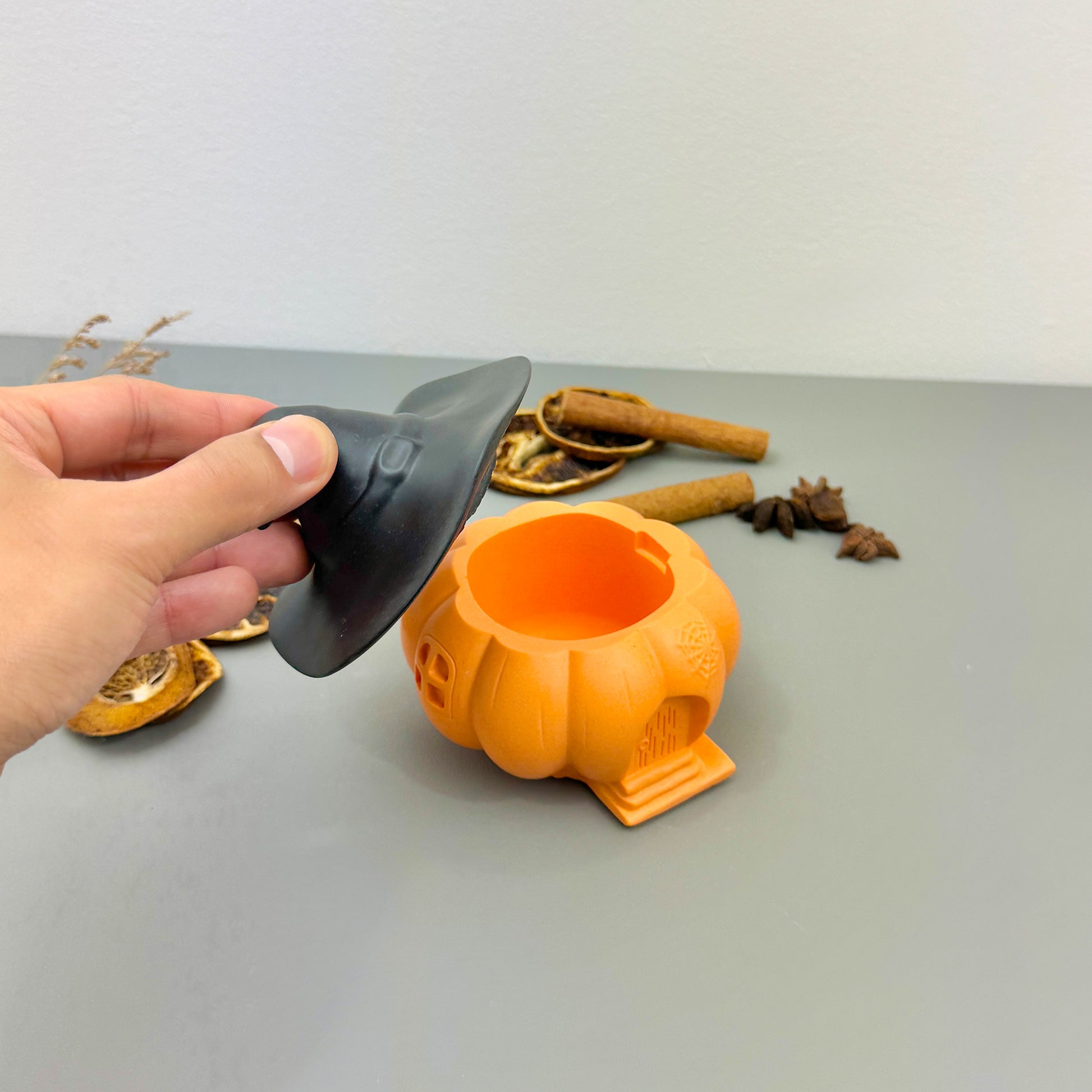 This Halloween pumpkin-shaped bowl features a detailed witch house design, complete with windows, a door, steps, and a spider web, topped with a black witch hat lid. Use it as a Halloween trick-or-treat sweet bowl, a stylish key dish, trinket dish, or catchall tray.
